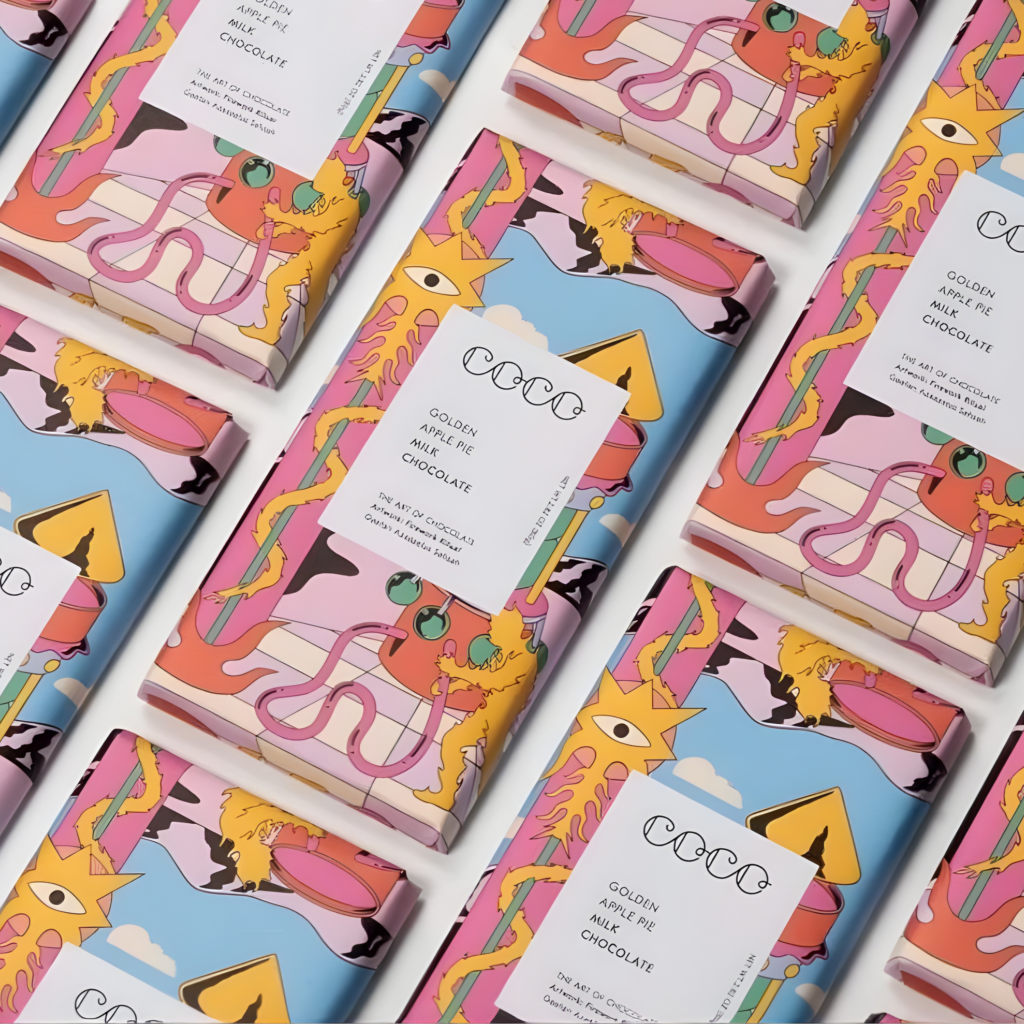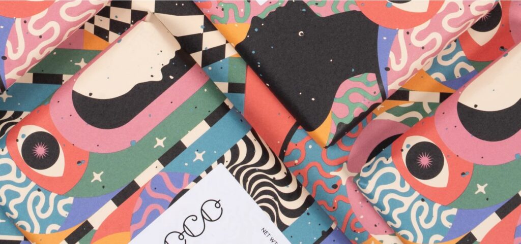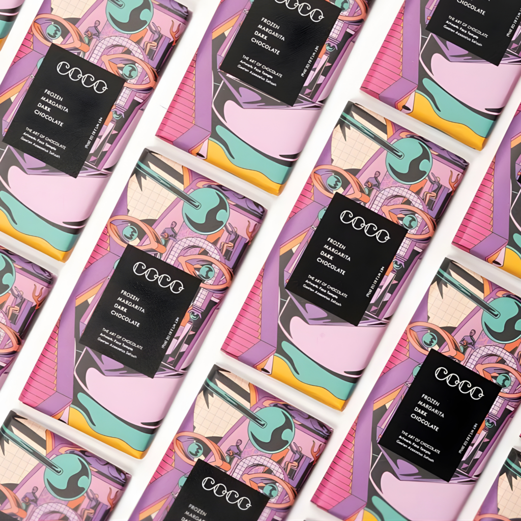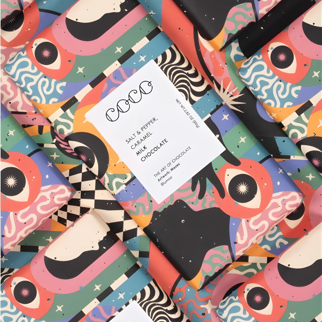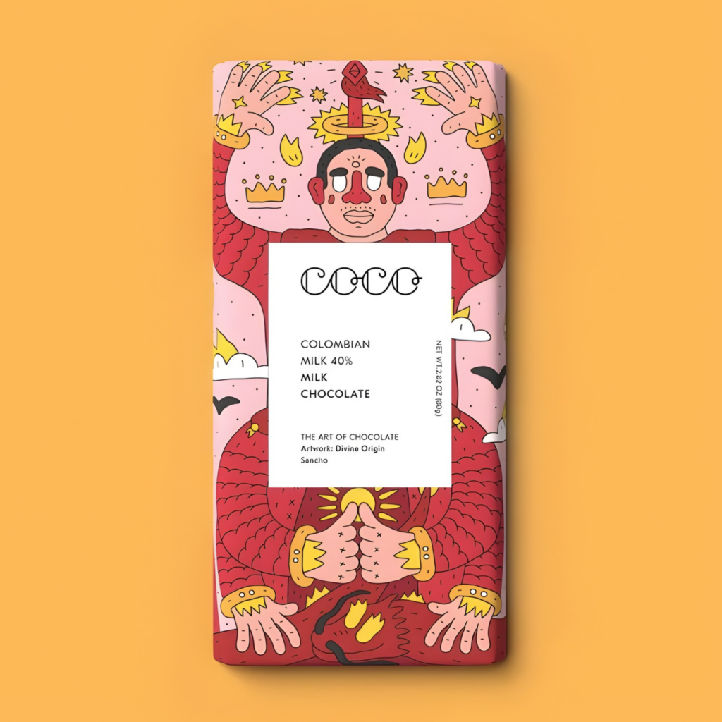 Envolvemos chocolate de origen ético en llamativas obras de arte de diseño creadas por artistas independientes, realzando así los momentos cotidianos.